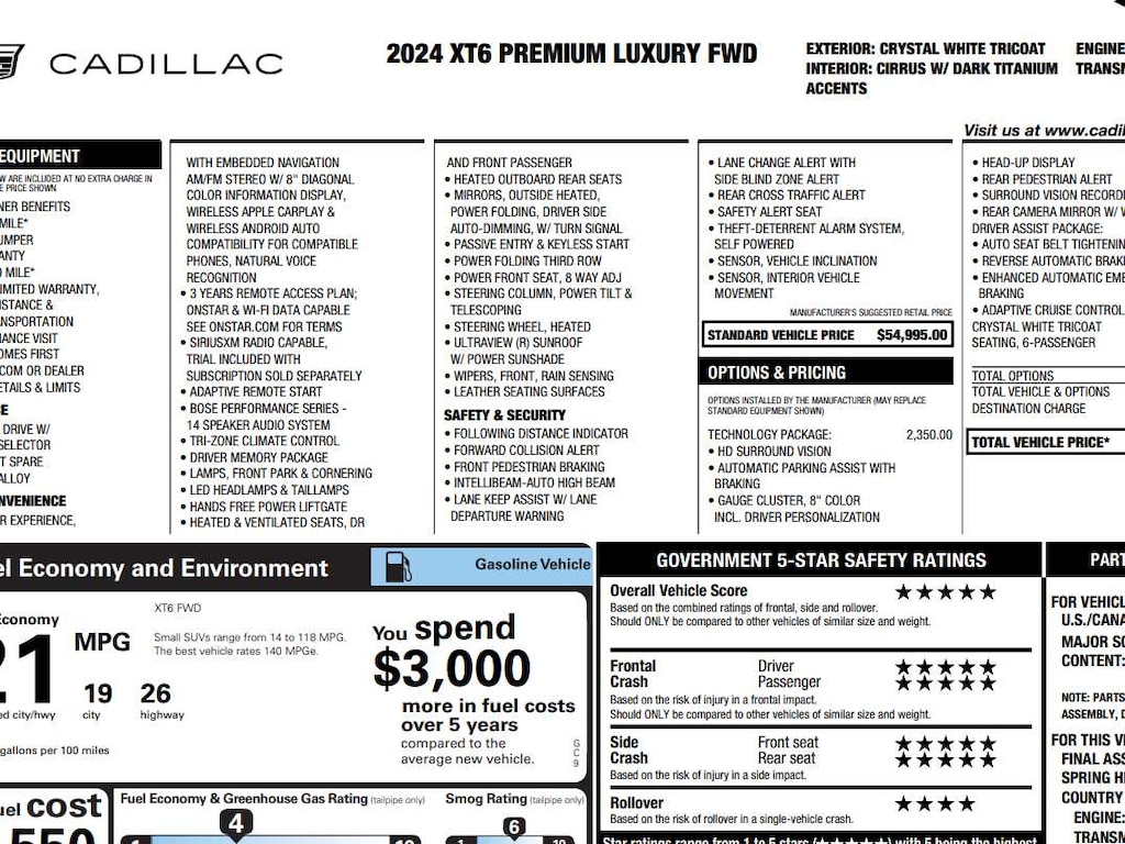 Leather Seats, Third Row Seat, Sunroof, Panoramic Roof, Power Liftgate Cadillac FWD Premium Luxury with Crystal White Tricoat exterior and Cirrus interior features a V6 Cylinder Engine with 310 HP at 6600 RPM*.