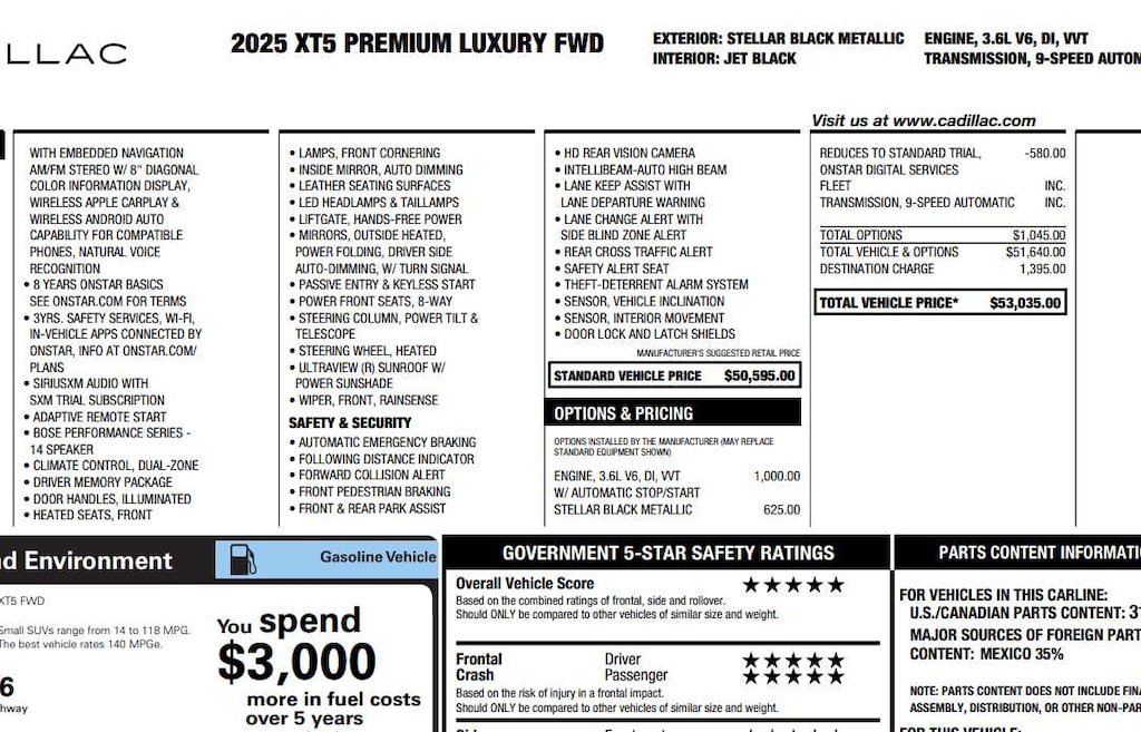 Leather Seats, Sunroof, Panoramic Roof, Power Liftgate, Heated Driver Seat. Cadillac FWD Premium Luxury with Stellar Black Metallic exterior and Jet Black interior features a V6 Cylinder Engine with 310 HP at 6600 RPM*.