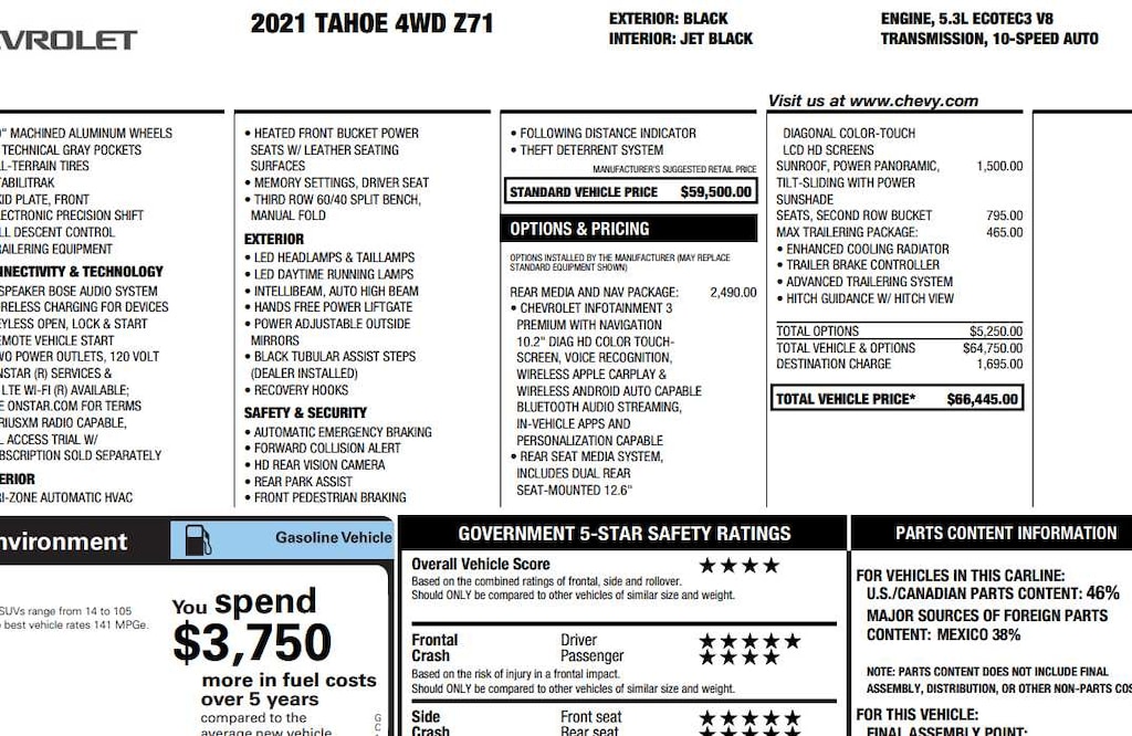 with express-open and close and power sunshade, SEATS, SECOND ROW BUCKET, MANUAL, AM/FM stereo, Bluetooth® audio streaming for 2 active devices, Apple CarPlay® and Android Auto® capable, enhanced voice recognition, additional memory for in-vehicle apps, cloud connected personalization for select infotainment and vehicle settings. Subscription required for enhanced and connected services after trial period. with Dynamic Fuel Management, Direct Injection and Variable Valve Timing, includes aluminum block construction (355 hp [265 kW] @ 5600 rpm, 383 lb-ft of torque [518 Nm] @ 4100 rpm) (STD), electronically controlled with overdrive, includes Traction Select System including tow/haul (Most vehicles built on or after 6-7-2021 with a V8 engine will have (NSS) Not Equipped with Automatic Stop/Start, which removes Automatic Stop/Start, Engine control stop/start disable button and its content.) (STD).