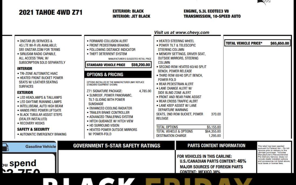 Z71 SIGNATURE PACKAGE: includes (WPL) Luxury Package content, (C3U) Panoramic power sunroof and (NHT) Max Trailering Package, includes (WPD) Driver Alert Package content, (UV2) HD Surround Vision, (UKK) Rear Pedestrian Alert, (A45) memory settings, (DXR) outside heated power-adjustable, power-folding, body-color mirrors with driver-side auto-dimming and integrated turn signal indicators, (N38) power tilt and telescopic steering column, (KI3) automatic heated steering wheel, (KA6) second row outboard heated seats, (ATT) second row power 60/40 split-folding bench seats and (AS8) third row power 60/40 split-folding bench seats, SEATS, SECOND ROW BUCKET, POWER RELEASE, AM/FM stereo, Bluetooth® audio streaming for 2 active devices, Apple CarPlay® and Android Auto® capable, enhanced voice recognition, in-vehicle apps, cloud connected personalization for select infotainment and vehicle settings. Subscription required for enhanced and connected services after trial period. (STD), with Dynamic Fuel Management, Direct Injection and Variable Valve Timing, includes aluminum block construction (355 hp [265 kW] @ 5600 rpm, 383 lb-ft of torque [518 Nm] @ 4100 rpm) (STD), electronically controlled with overdrive, includes Traction Select System including tow/haul (Most vehicles built on or after 6-7-2021 with a V8 engine will have (NSS) Not Equipped with Automatic Stop/Start, which removes Automatic Stop/Start, Engine control stop/start disable button and its content.) (STD), includes (UHX) Lane Keep Assist with Lane Departure Warning, (UKC) Lane Change Alert with Side Blind Zone Alert, (UFG) Rear Cross Traffic Alert and (UD5) Front and Rear Park Assist.
