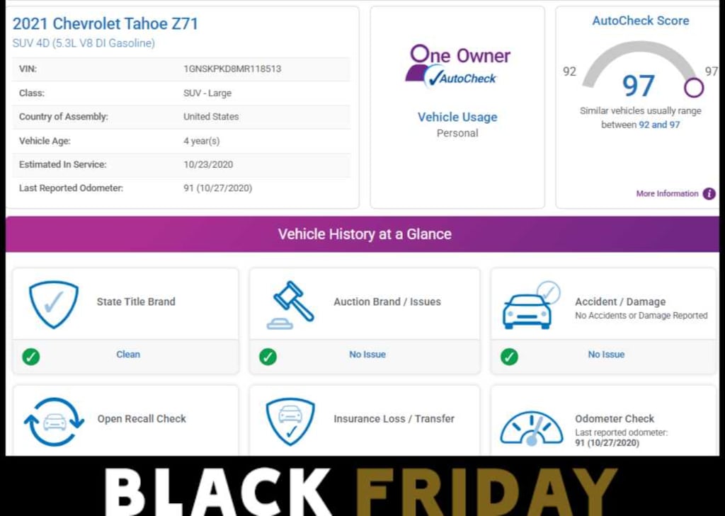 AutoCheck One Owner Was $47,990. This Tahoe is priced $800 below Kelley Blue Book.