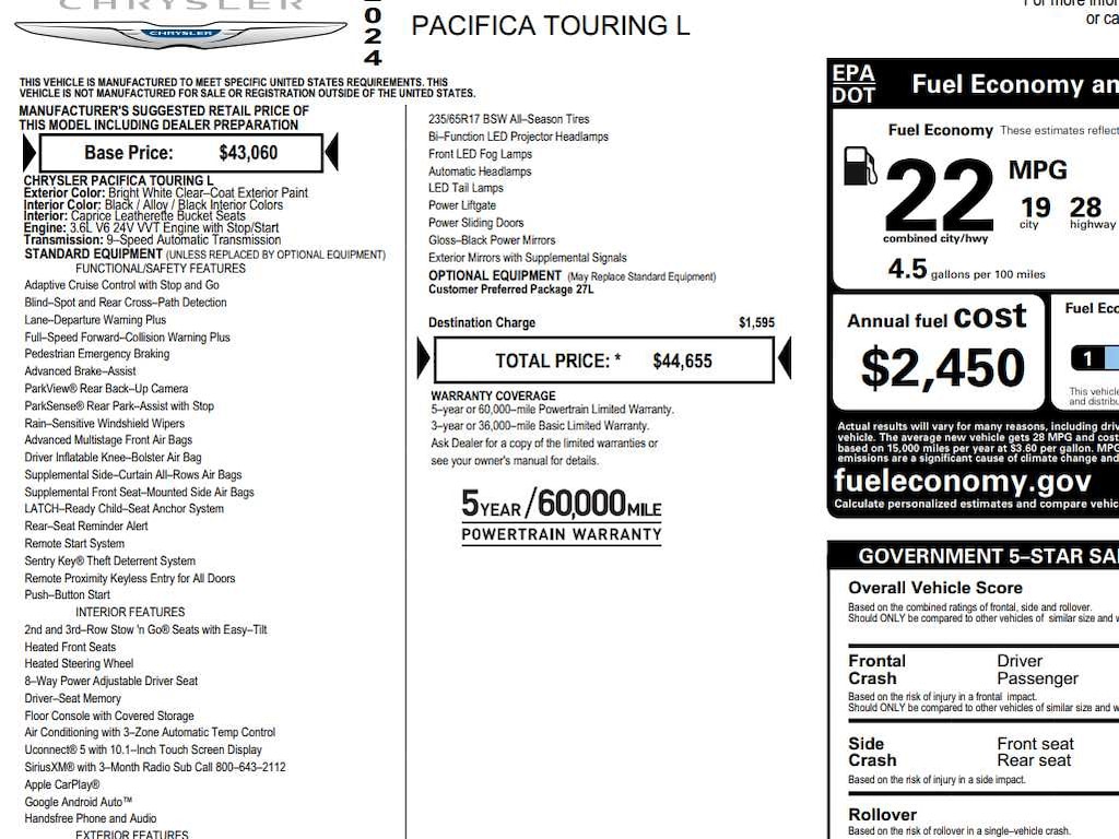 Third Row Seat, Quad Bucket Seats, Power Liftgate, Rear Air, Heated Driver Seat. Chrysler Touring L with Bright White Clearcoat exterior and Black/Alloy/Black interior features a V6 Cylinder Engine with 287 HP at 6400 RPM*.