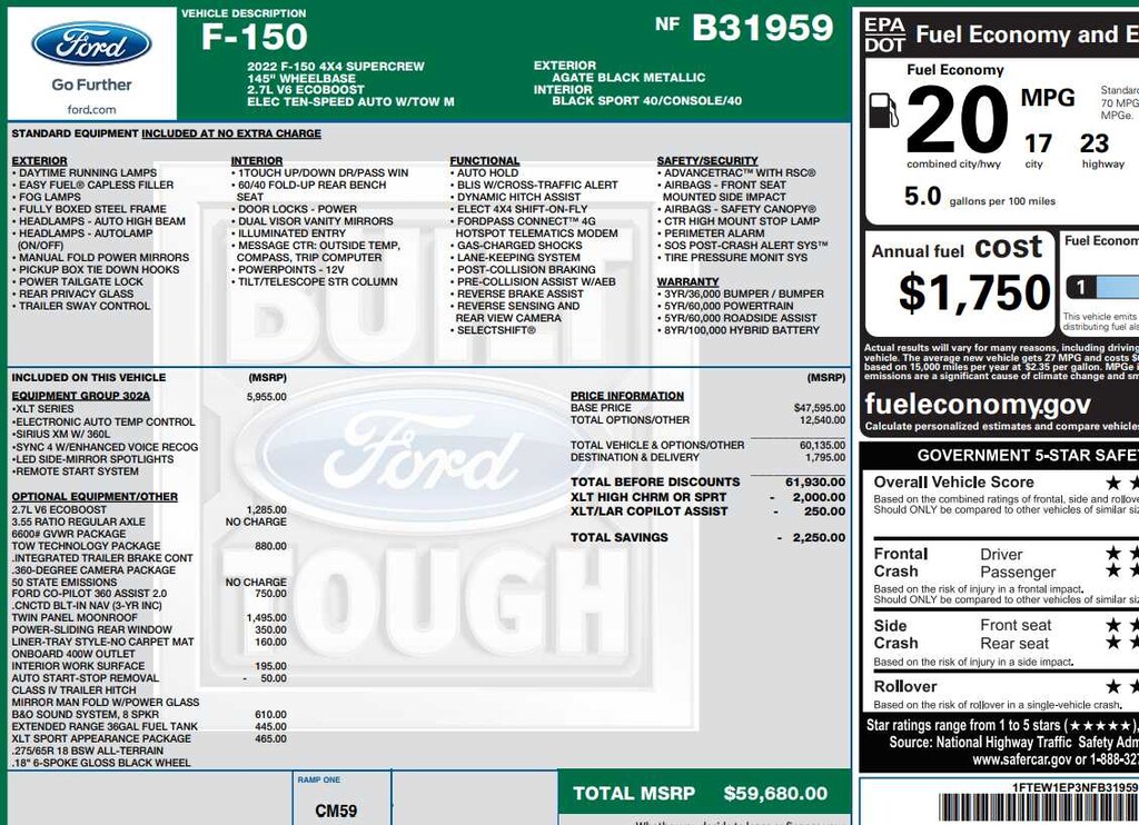 Class IV Trailer Hitch Receiver, towing capability up to TBD lbs, on 3.3L V6 PFDI engine (99B) and 2.7L EcoBoost engine (99P) or up to TBD lbs, on 3.5L EcoBoost engine (998) and 5.0L V8 engine (995), 7/4-pin connector, class IV trailer hitch receiver, smart trailer tow connector ( BLIS w/trailer tow coverage where BLIS is available), XLT Chrome Appearance Package, lower grille trim, Chrome Single-Tip Exhaust, Tires: 275/65R18 BSW Automatic Transmission, Chrome Door & Tailgate Handles w/Body-Color Bezel, bezel on side doors and black on tailgate, Wheels: 18 Chrome-Like PVD, 2-Bar Style Grille w/Chrome 2 Minor Bars, silver painted surround and black background mesh, Bright Polished Step Bars, Zone Lighting, Leather-Wrapped Steering Wheel, Intelligent Access w/Push Button Start, approach detection, SecuriCode, TWIN PANEL MOONROOF, 3.55 Axle Ratio, GVWR: 6,600 lbs Payload Package, smart trailer tow connector and BLIS w/trailer tow coverage where BLIS is available, Integrated Trailer Brake Controller, 360 Degree Camera, trailer reverse guidance, Pro Trailer Backup Assist, rain-sensing wipers and forward sensing system, Evasive Steering Assist, Intelligent Adaptive Cruise Control w/Stop & Go, lane centering, Speed Sign Recognition, Connected Built-In Navigation (DISC), Navigation services require SYNC4 and FordPass Connect (optional on select vehicles), complimentary connect service and the FordPass app (see FordPass Terms for details), Eligible vehicles receive a complimentary 90-day trial of navigation services that begins on the new vehicle warranty start date, Customers must unlock the navigation service trial by activating the eligible vehicle w/a FordPass member account, If not subscribed by the end of the complimentary period, the navigation service will terminate, Connected service and features depend on compatible AT&T network availability, Evolving, HD radio and 8 speakers including subwoofer, body-color wheellip moldings and unique interior finish, Box Side Decals, Chrome Single-Tip Exhaust, Body-Color Door & Tailgate Handles, body-color bezel on side doors and black on tailgate, Tires: 275/65R18 BSW Automatic Transmission, Wheels: 18 6-Spoke Machined Aluminum, gloss black painted pockets, Accent-Color Step Bars, Body-Color Front & Rear Bumpers, body-color front fascia, Black 2-Bar Style Grille w/Black Surround/Accents, selectable drive modes: normal, ECO, sport, tow/haul, slippery, deep snow/sand and mud/rut (STD).