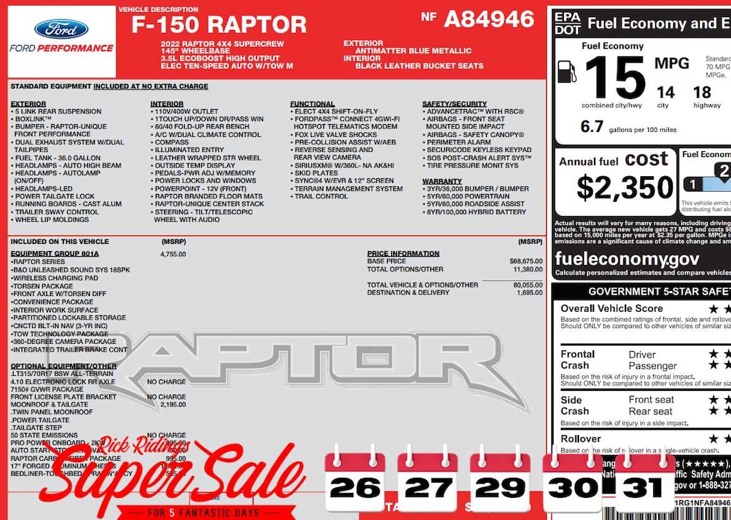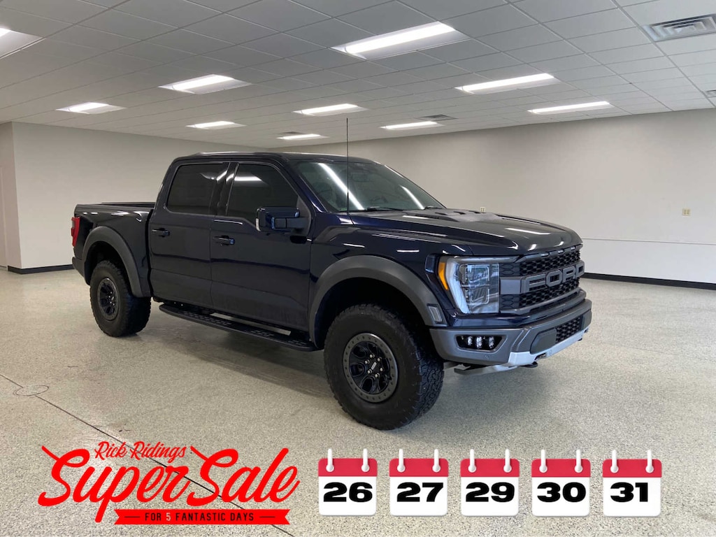 Leather Seats, Heated Driver Seat, Cooled Driver Seat, Running Boards, iPod/MP3 Input. Ford Raptor with Antimatter Blue Metallic exterior and Black interior features a V6 Cylinder Engine with 450 HP at 5000 RPM*.