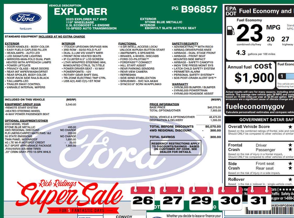 EQUIPMENT GROUP 202A SecuriCode Keyless Entry Keypad, Acoustic-Laminated Front Side Windows, Remote Start System, Heated Steering Wheel, LED Fog Lamps, silver-painted front skid plate elements, XLT SPORT APPEARANCE PACKAGE carbonized gray-painted grille bars and mesh insert, liftgate applique, lower body side cladding insert, skid plate elements, carbonized gray EXPLORER badge on hood, stretch diamond instrument panel appliques, ebony/light slate seats w/medium slate contrast stitching in all rows, unique light slate door-trim panel insert w/contrast stitching and sideview mirrors w/gloss black caps, Wheels: 20 10-Spoke Carbonized Gray-Painted, Tires: P255/55R20 AS BSW, Dual Chrome Exhaust Tips, TWIN PANEL MOONROOF, TRANSMISSION: 10-SPEED AUTOMATIC (STD).