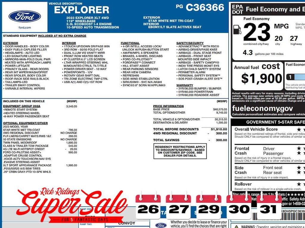 EQUIPMENT GROUP 202A SecuriCode Keyless Entry Keypad, Acoustic-Laminated Front Side Windows, Remote Start System, Heated Steering Wheel, LED Fog Lamps, silver-painted front skid plate elements, XLT SPORT APPEARANCE PACKAGE carbonized gray-painted grille bars and mesh insert, liftgate applique, lower body side cladding insert, skid plate elements, carbonized gray EXPLORER badge on hood, stretch diamond instrument panel appliques, ebony/light slate seats w/medium slate contrast stitching in all rows, unique light slate door-trim panel insert w/contrast stitching and sideview mirrors w/gloss black caps, Wheels: 20 10-Spoke Carbonized Gray-Painted, Tires: P255/55R20 AS BSW, Dual Chrome Exhaust Tips, TWIN PANEL MOONROOF, FORD CO-PILOT360 ASSIST+ Speed Sign Recognition, Voice-Activated Touchscreen Navigation System, pinch-to-zoom capability, SiriusXM Traffic and Travel Link, Note: SiriusXM Traffic and Travel Link includes a, SiriusXM Traffic and Travel Link service is not available in Alaska or Hawaii, After your trial period ends, Sirius XM audio and data services each require a subscription sold separately, or as a package, by SiriusXM Radio Inc, See SiriusXM customer agreement for complete terms at www.siriusxm.com, All fees and programming subject to change, Trial subscriptions not available in Alaska and Hawaii, Evasive Steering Assist, Intelligent Adaptive Cruise Control, stop-and-go and lane centering, CLASS IV TRAILER TOW PACKAGE, TRANSMISSION: 10-SPEED AUTOMATIC (STD).