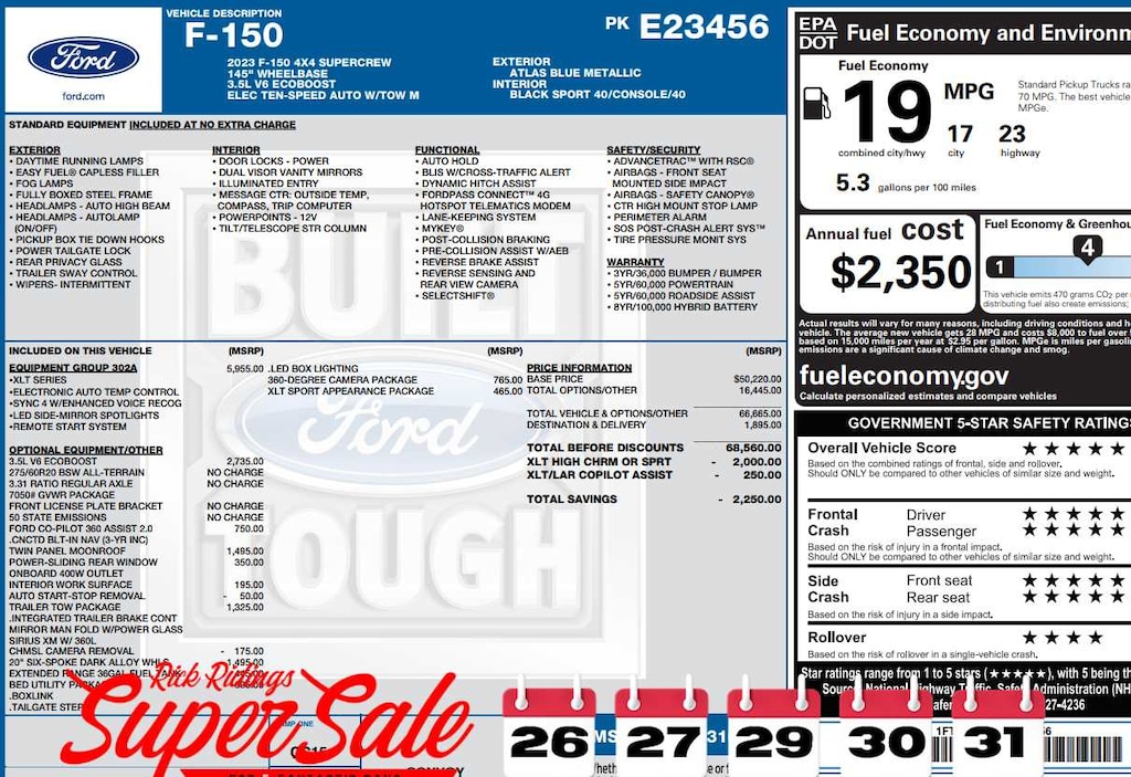 EQUIPMENT GROUP 302A HIGH Class IV Trailer Hitch Receiver, towing capability up to TBD lbs, on 3.3L V6 PFDI engine (99B) and 2.7L EcoBoost engine (99P) or up to TBD lbs, on 3.5L EcoBoost engine (998) and 5.0L V8 engine (995), 7/4-pin connector, class IV trailer hitch receiver, smart trailer tow connector ( BLIS w/trailer tow coverage where BLIS is available), XLT Chrome Appearance Package, lower grille trim, Chrome Single-Tip Exhaust, Tires: 275/65R18 BSW Automatic Transmission, Chrome Door & Tailgate Handles w/Body-Color Bezel, bezel on side doors and black on tailgate, Wheels: 18 Chrome-Like PVD, 2-Bar Style Grille w/Chrome 2 Minor Bars, silver painted surround and black background mesh, Bright Polished Step Bars, Zone Lighting, Intelligent Access w/Push Button Start, approach detection, SecuriCode, ENGINE: 3.5L V6 ECOBOOST GVWR: 7,050 lbs Payload Package, 3.31 Axle Ratio, TWIN PANEL MOONROOF, WHEELS: 20 6-SPOKE DARK ALLOY PAINTED ALUMINUM Tires: 275/60R20 BSW AT, 360 DEGREE CAMERA trailer reverse guidance, FORD CO-PILOT360 ASSIST 2.0 rain-sensing wipers, Evasive Steering Assist, Connected Built-In Navigation, Navigation services require SYNC4 and FordPass Connect (optional on select vehicles), complimentary connect service and the FordPass app (see FordPass Terms for details), Eligible vehicles receive a complimentary 90-day trial of navigation services that begins on the new vehicle warranty start date, Customers must unlock the navigation service trial by activating the eligible vehicle w/a FordPass member account, If not subscribed by the end of the complimentary period, the navigation service will terminate, Connected service and features depend on compatible AT&T network availability, Evolving technology/cellular networks/vehicle capability may limit functionality and prevent operation, BED UTILITY PACKAGE BoxLink, 4 premium locking cleats, Zone Lighting, LED Box Lighting, Tailgate Step w/Tailgate Work Surface, XLT SPORT APPEARANCE PACKAGE body-color wheellip moldings and unique interior finish, Box Side Decals, Body-Color Door & Tailgate Handles, body-color bezel on side doors and black on tailgate, Tires: 275/65R18 BSW Automatic Transmission, Wheels: 18 6-Spoke Machined Aluminum, gloss black painted pockets, Accent-Color Step Bars, Body-Color Front & Rear Bumpers, body-color front fascia, Black 2-Bar Style Grille w/Black Surround/Accents, TRANSMISSION: ELECTRONIC 10-SPEED AUTOMATIC selectable drive modes: normal, ECO, sport, tow/haul, slippery, deep snow/sand and mud/rut (STD).