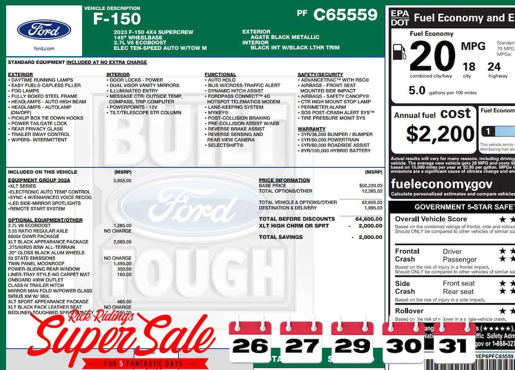 EQUIPMENT GROUP 302A HIGH Class IV Trailer Hitch Receiver, towing capability up to TBD lbs, on 3.3L V6 PFDI engine (99B) and 2.7L EcoBoost engine (99P) or up to TBD lbs, on 3.5L EcoBoost engine (998) and 5.0L V8 engine (995), 7/4-pin connector, class IV trailer hitch receiver, smart trailer tow connector ( BLIS w/trailer tow coverage where BLIS is available), XLT Chrome Appearance Package, lower grille trim, Chrome Single-Tip Exhaust, Tires: 275/65R18 BSW Automatic Transmission, Chrome Door & Tailgate Handles w/Body-Color Bezel, bezel on side doors and black on tailgate, Wheels: 18 Chrome-Like PVD, 2-Bar Style Grille w/Chrome 2 Minor Bars, silver painted surround and black background mesh, Bright Polished Step Bars, Zone Lighting, Intelligent Access w/Push Button Start, approach detection, SecuriCode, XLT BLACK APPEARANCE PACKAGE Black 6 Angular Step Bars, Black Exterior Badging, Wheels: 20 Gloss Black Painted Aluminum, Tires: 275/60R20 BSW AT, Unique Hood & Grille w/Black Accent, Dark Interior Appliques, Matte Black Tailgate F-150 Decal, TWIN PANEL MOONROOF, ENGINE: 2.7L V6 ECOBOOST 3.55 Axle Ratio, GVWR: 6,600 lbs Payload Package, TOUGH BED SPRAY-IN BEDLINER, TRANSMISSION: ELECTRONIC 10-SPEED AUTOMATIC selectable drive modes: normal, ECO, sport, tow/haul, slippery, deep snow/sand and mud/rut (STD).