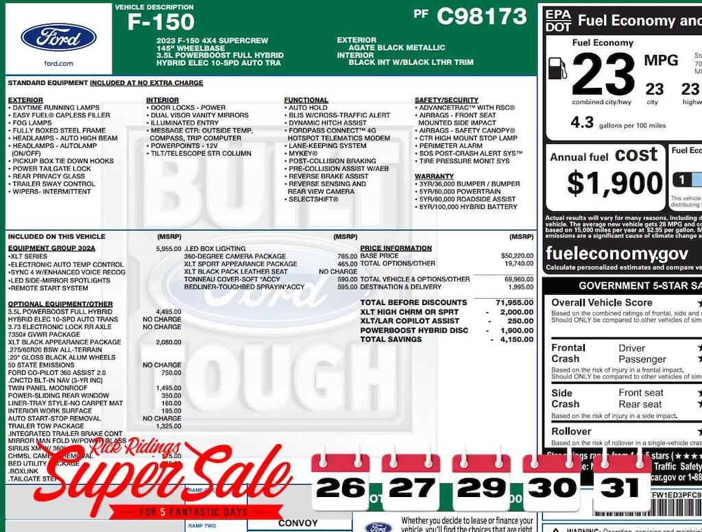 EQUIPMENT GROUP 302A HIGH Class IV Trailer Hitch Receiver, towing capability up to TBD lbs, on 3.3L V6 PFDI engine (99B) and 2.7L EcoBoost engine (99P) or up to TBD lbs, on 3.5L EcoBoost engine (998) and 5.0L V8 engine (995), 7/4-pin connector, class IV trailer hitch receiver, smart trailer tow connector ( BLIS w/trailer tow coverage where BLIS is available), XLT Chrome Appearance Package, lower grille trim, Chrome Single-Tip Exhaust, Tires: 275/65R18 BSW Automatic Transmission, Chrome Door & Tailgate Handles w/Body-Color Bezel, bezel on side doors and black on tailgate, Wheels: 18 Chrome-Like PVD, 2-Bar Style Grille w/Chrome 2 Minor Bars, silver painted surround and black background mesh, Bright Polished Step Bars, Zone Lighting, Intelligent Access w/Push Button Start, approach detection, SecuriCode, ENGINE: 3.5L POWERBOOST FULL-HYBRID V6 Electronic Locking w/3.73 Axle Ratio, GVWR: 7,350 lbs Payload Package, Dual Zone Electronic Automatic Temperature Control, XLT BLACK APPEARANCE PACKAGE Black 6 Angular Step Bars, Black Exterior Badging, Wheels: 20 Gloss Black Painted Aluminum, Tires: 275/60R20 BSW AT, Unique Hood & Grille w/Black Accent, Dark Interior Appliques, Matte Black Tailgate F-150 Decal, TWIN PANEL MOONROOF, 360 DEGREE CAMERA trailer reverse guidance, FORD CO-PILOT360 ASSIST 2.0 rain-sensing wipers, Evasive Steering Assist, Connected Built-In Navigation, Navigation services require SYNC4 and FordPass Connect (optional on select vehicles), complimentary connect service and the FordPass app (see FordPass Terms for details), Eligible vehicles receive a complimentary 90-day trial of navigation services that begins on the new vehicle warranty start date, Customers must unlock the navigation service trial by activating the eligible vehicle w/a FordPass member account, If not subscribed by the end of the complimentary period, the navigation service will terminate, Connected service and features depend on compatible AT&T network availability, Evolving technology/cellular networks/vehicle capability may limit functionality and prevent operation, BED UTILITY PACKAGE BoxLink, 4 premium locking cleats, Zone Lighting, LED Box Lighting, Tailgate Step w/Tailgate Work Surface, TOUGH BED SPRAY-IN BEDLINER, SOFT FOLDING TONNEAU PICKUP BOX COVER.