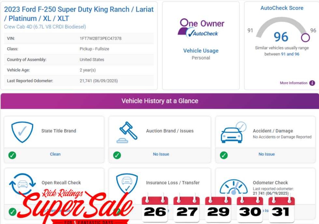 AutoCheck One Owner Reduced from $73,990. This Super Duty F-250 Pickup is priced $500 below Kelley Blue Book.