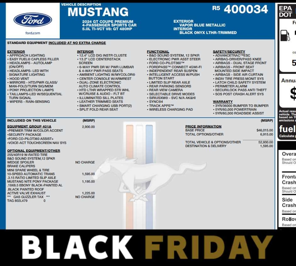 Premier Trim w/Color Accent Group, accent stitched center console lid, wrapped knee bolsters w/accent stitch and shifter boot, leather-wrapped steering wheel, 5-piece w/chrome bezel, unique color-accented door-trim, wrapped center console w/accent stitch, Premium Floor Mats w/Metal Gray Accent Stitch, Seat Belt w/Color Accent, Illuminated Door-Sill Scuff Plates, Security Package, Active Anti-Theft System, Locking Center Console, Wheel Locking Kit, B&O Sound System by Bang & Olufsen, 12 speakers and subwoofer in-trunk, Ford Co-Pilot360 Assist+, Pre-Collision Assist w/Automatic Emergency Braking, Evasive Steering Assist, Connected Built-In Navigation, Navigation services require SYNC®4 and FordPass Connect (optional on select vehicles), complimentary connect service and the FordPass app (see, paddle shifters and remote rev, 3.15 Limited-Slip Rear-Axle, Leather-Wrapped Shift Knob, Remote Start System, stop/start system and Port Fueled Direct Injection (PFDI) (STD).