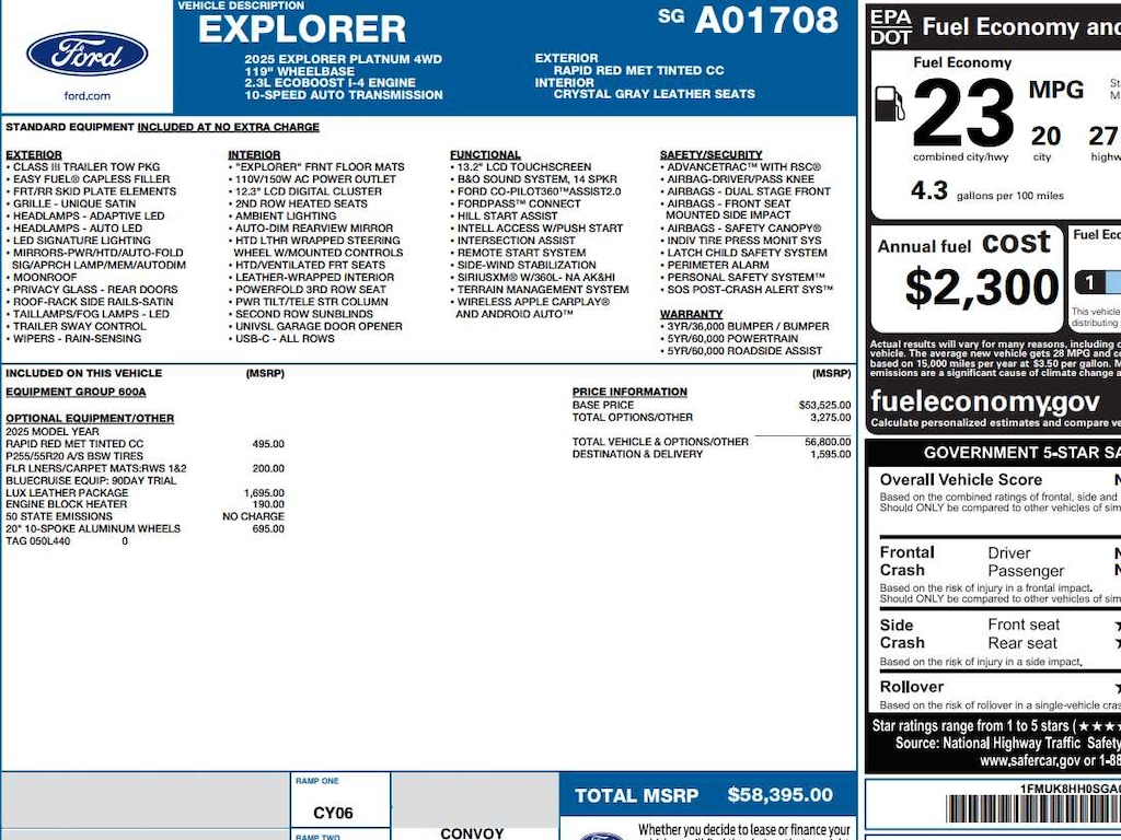 Third Row Seat, Navigation, Sunroof, Panoramic Roof, Quad Bucket Seats Ford Platinum with Rapid Red Metallic Tinted Clearcoat exterior and Salt Crystal/Onyx interior features a 4 Cylinder Engine with 300 HP at 5500 RPM*.