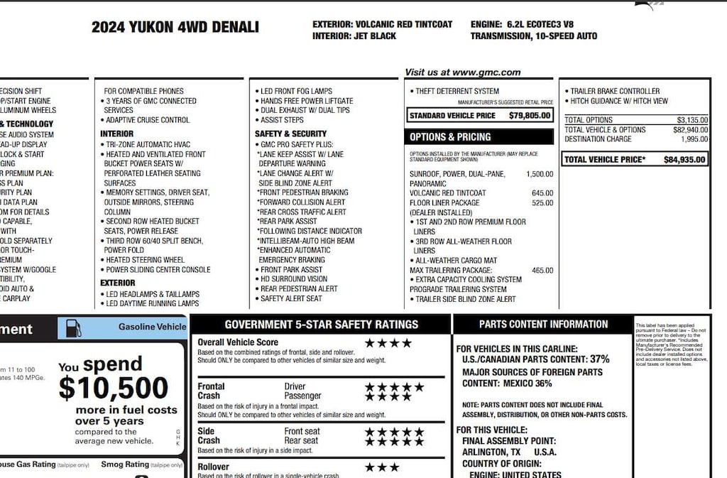 Leather Seats, Third Row Seat, Quad Bucket Seats, Power Liftgate, Rear Air. GMC Denali with Volcanic Red Tintcoat exterior and Jet Black interior features a 8 Cylinder Engine with 420 HP at 5600 RPM*.