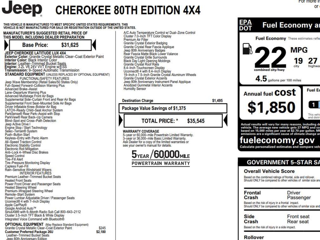Engine: 3.2L V6 24V VVT w/ESS, Transmission: 9-Speed 948TE Automatic, Granite Crystal Rear Fascia Applique, Berber Floor Mats w/80th Anniversary Tag, Granite Crystal Roof Rails, Black Day Light Opening Moldings, Granite Crystal Exterior Badging, Air Conditioning ATC w/Dual Zone Control, Jeep 80th Anniversary Edition, Anodized Gun Metal Interior Accents, Light Tungsten Interior Accents, Cluster 7 TFT Color Display, Jeep 80th Anniversary Instrumental Panel Applique, Rear Fascia Lower Valance Matte Black, Humidity Sensor, 8.4 Touchscreen Display, Granite Crystal Exterior Accents, Jeep 80th Anniversary Badges, Power Front/Fixed Rear Full Sunroof, Granite Crystal Grille Surrounds, Premium Air Filter, (STD), (STD).