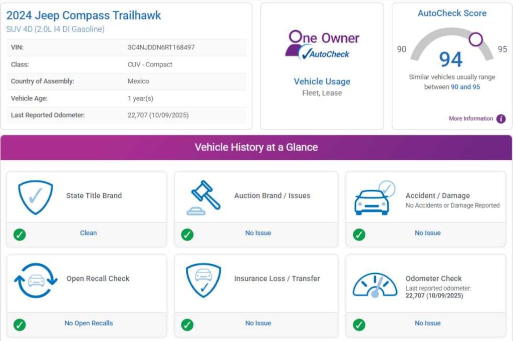 AutoCheck One Owner This Compass is priced $3,400 below Kelley Blue Book.