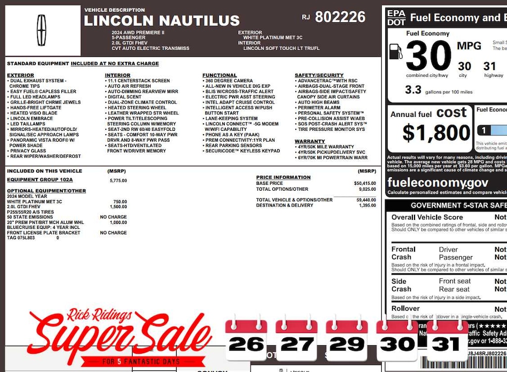 Panoramic Vista Roof, Hands-Free Power Liftgate, Revel Audio System w/14 Speakers & HD Radio, SiriusXM radio and AM/FM, 110V Power Converter, Digital Scent, 3 scent cartridges (violet cashmere, mystic forest, ozonic azure), Lincoln BlueCruise Equipped (4-Years Included), See lincoln.com/bluecruise for version details, Auto Air Refresh, Rear Heated Seats w/Switch Control, auto start-stop technology, 3.37 Axle Ratio, Transmission: CVT Auto Power Split Electric, carbonized painted pockets, Tires: 255/55R20 AS BSW.