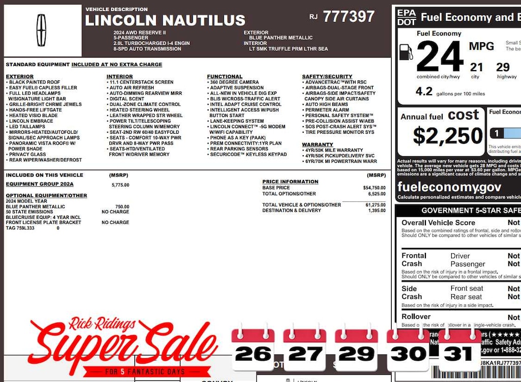 EQUIPMENT GROUP 202A Panoramic Vista Roof, Hands-Free Power Liftgate, Revel Audio System w/14 Speakers & HD Radio, SiriusXM radio and AM/FM, 110V Power Converter, Digital Scent, 3 scent cartridges (violet cashmere, mystic forest, ozonic azure), Lincoln BlueCruise Equipped (4-Years Included), See lincoln.com/bluecruise for version details, Auto Air Refresh, Rear Heated Seats w/Switch Control.