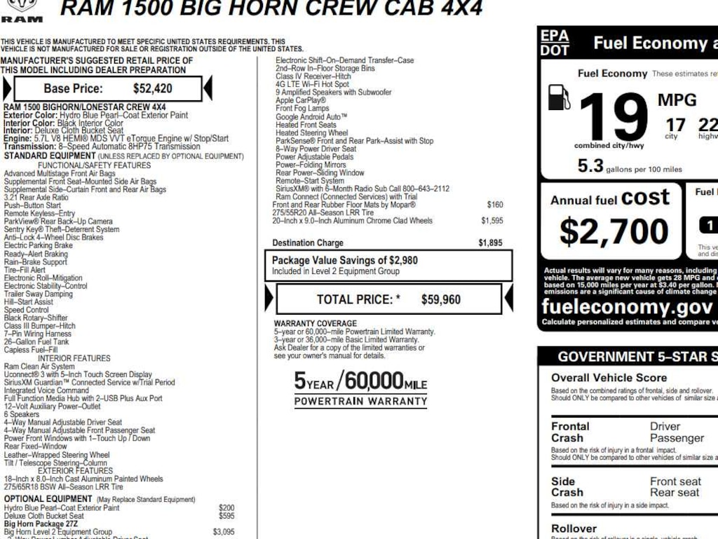 Back-Up Camera, iPod/MP3 Input, Onboard Communications System, Keyless Start. Ram Big Horn with Hydro Blue Pearlcoat exterior and Black interior features a 8 Cylinder Engine with 395 HP at 5600 RPM*.